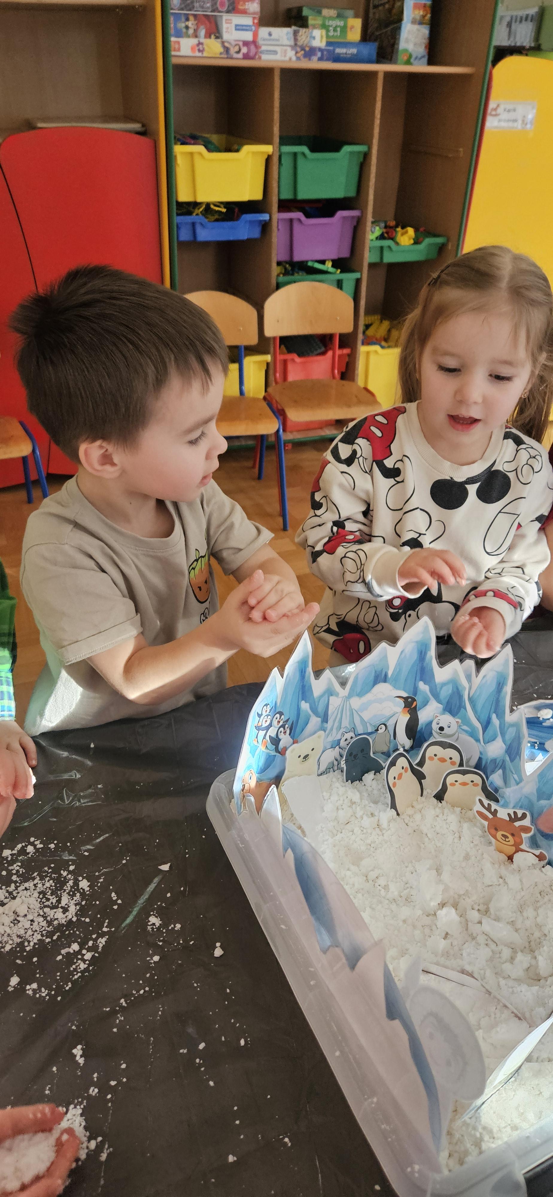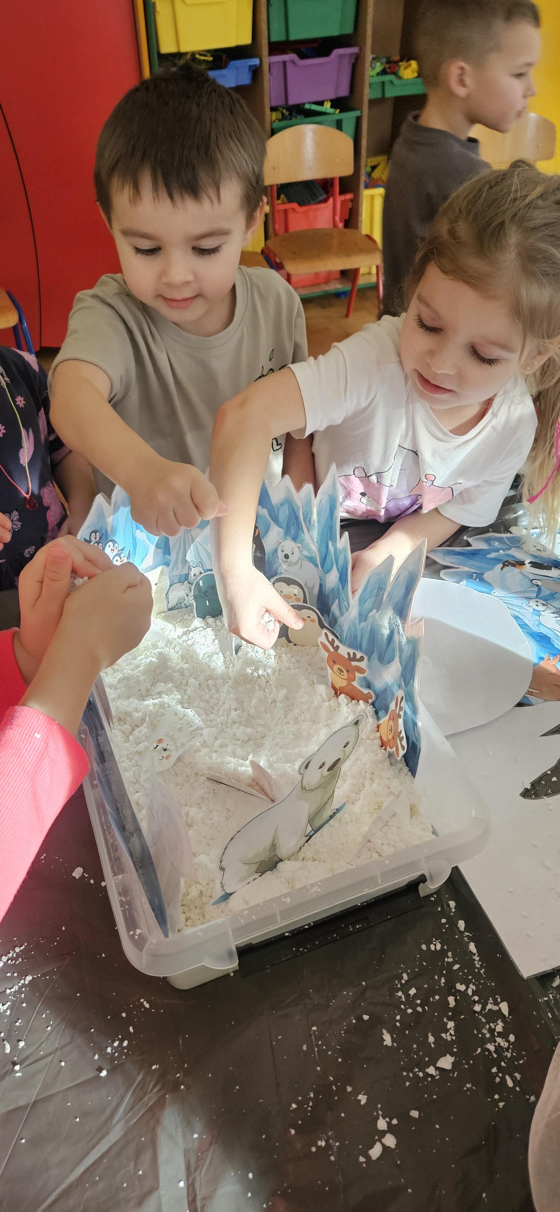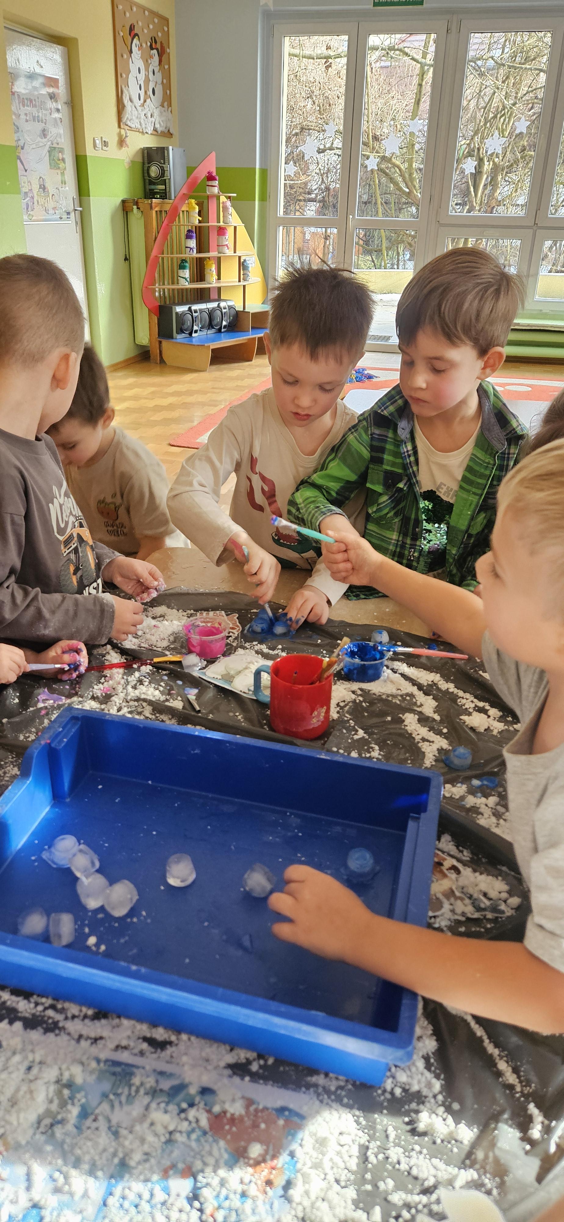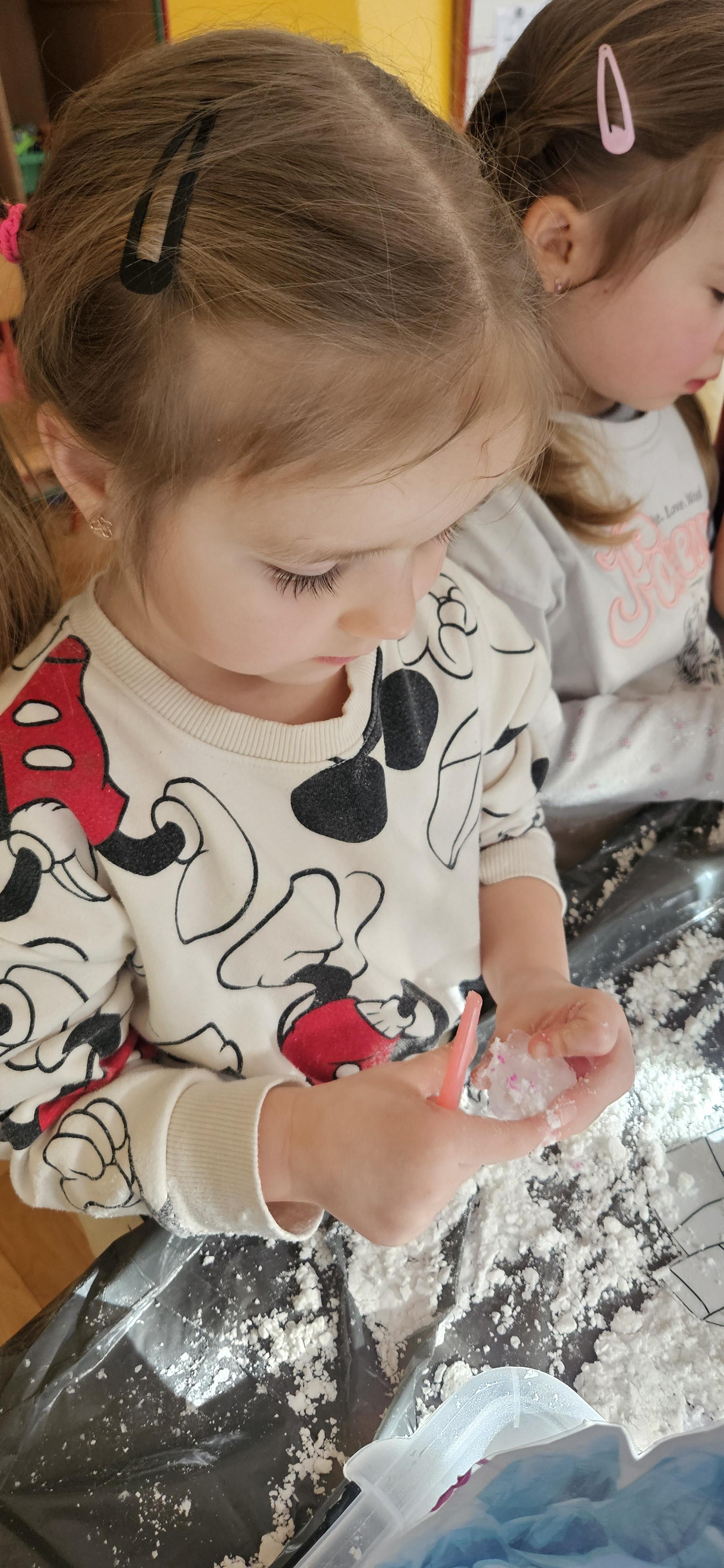 Zabawy ze sztucznym śniegiem oraz malowanie kostek lodu farbami.