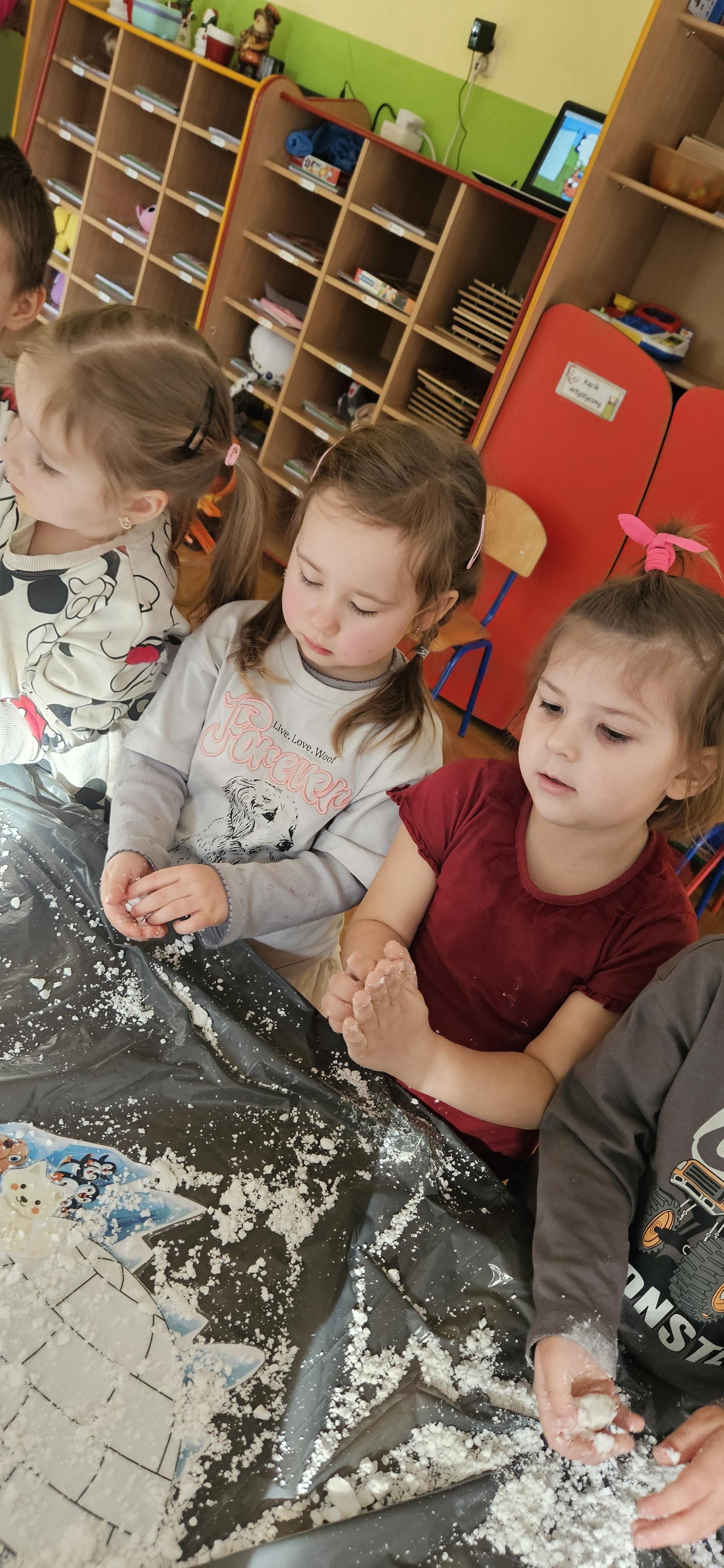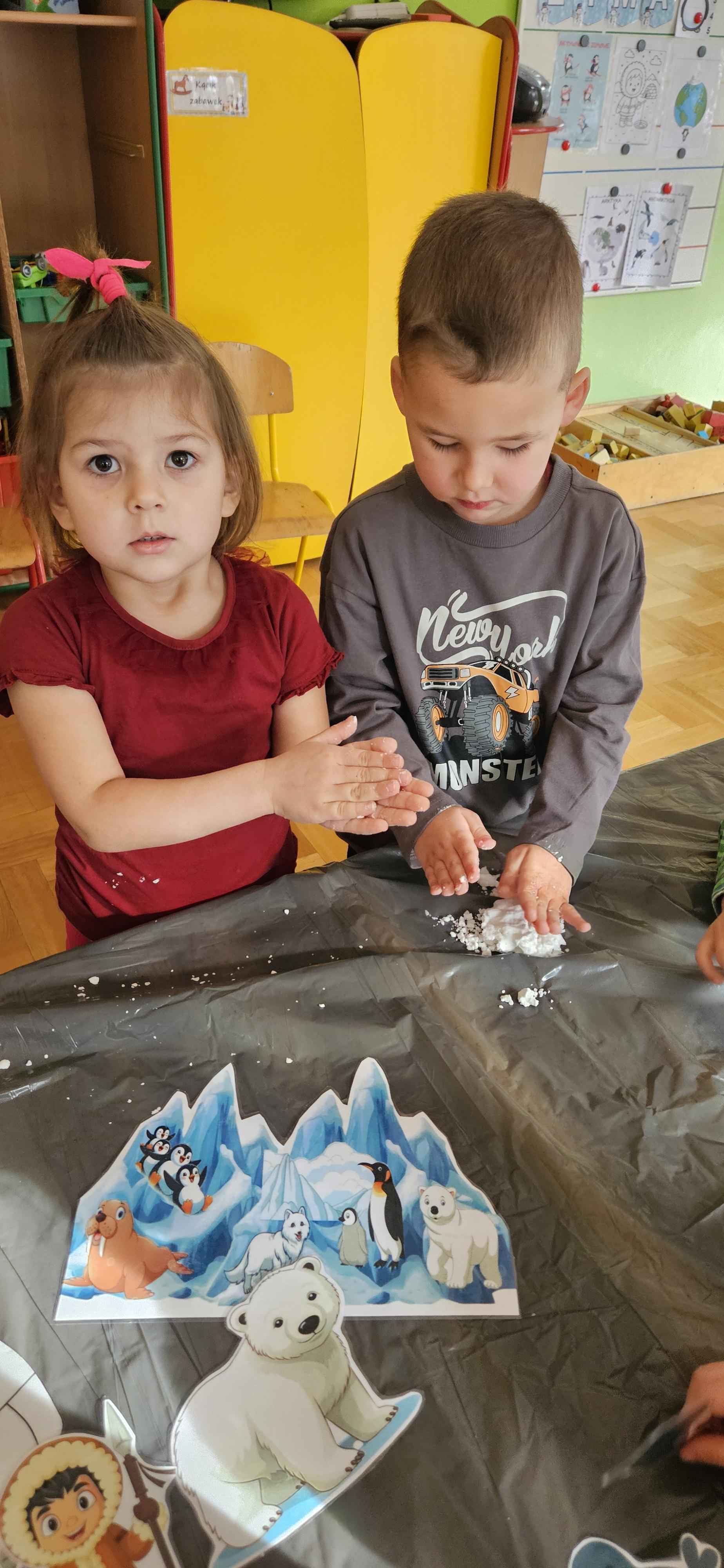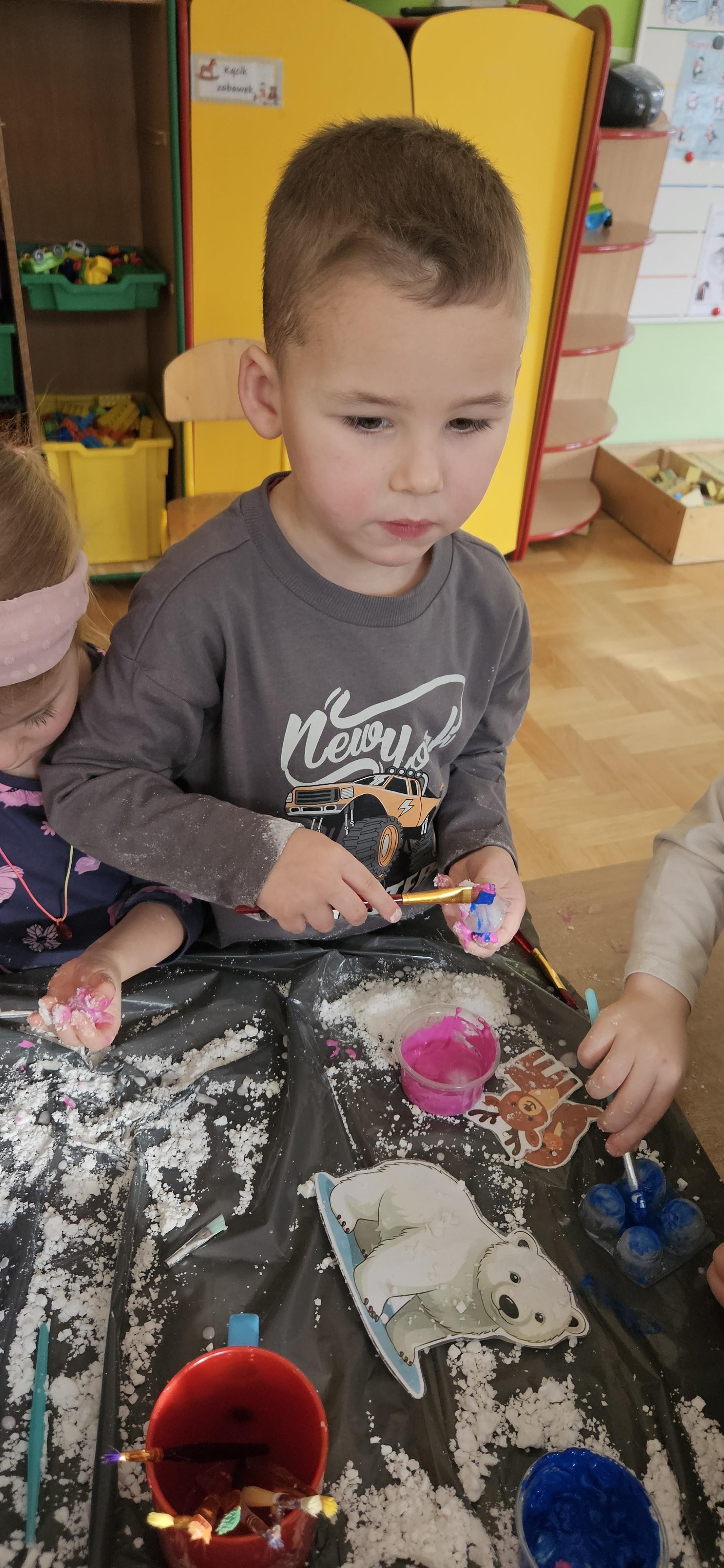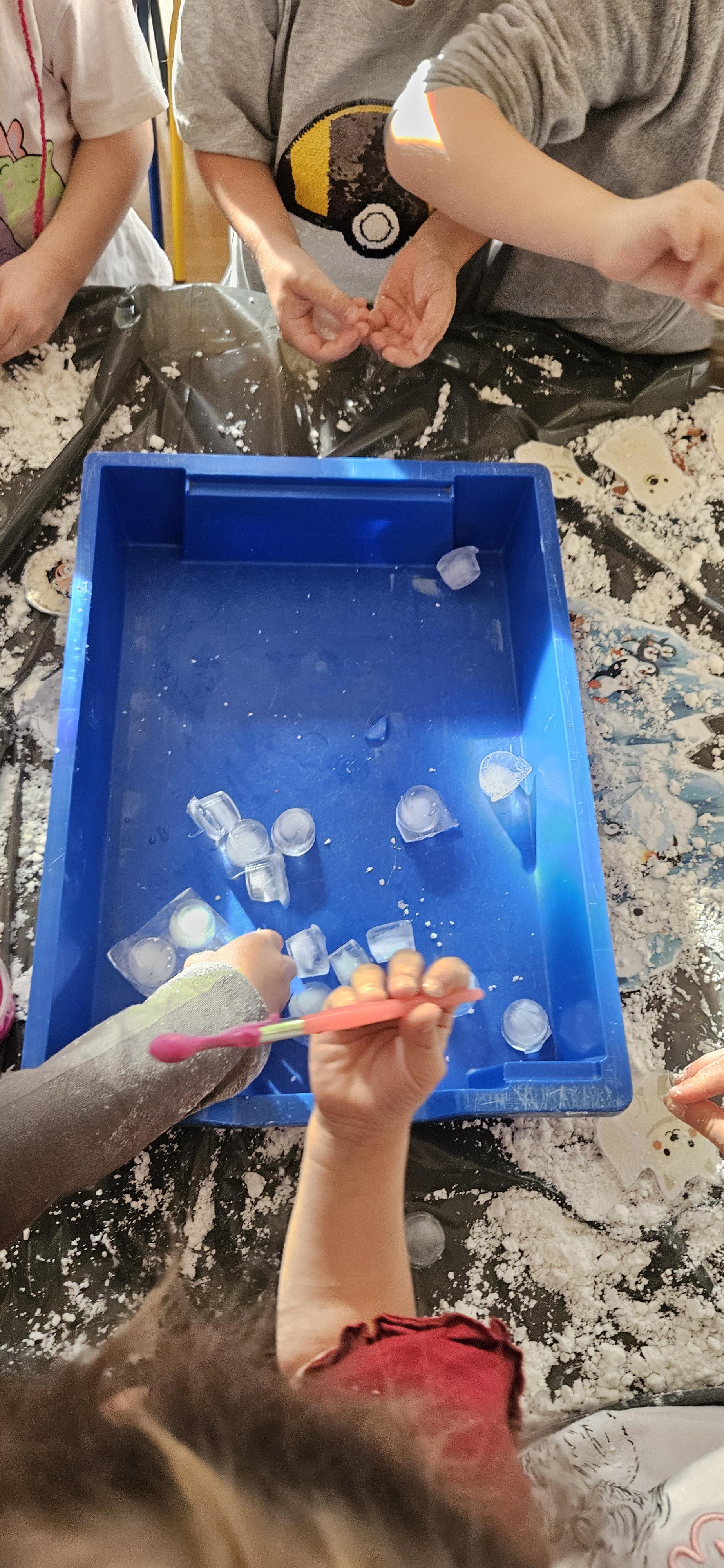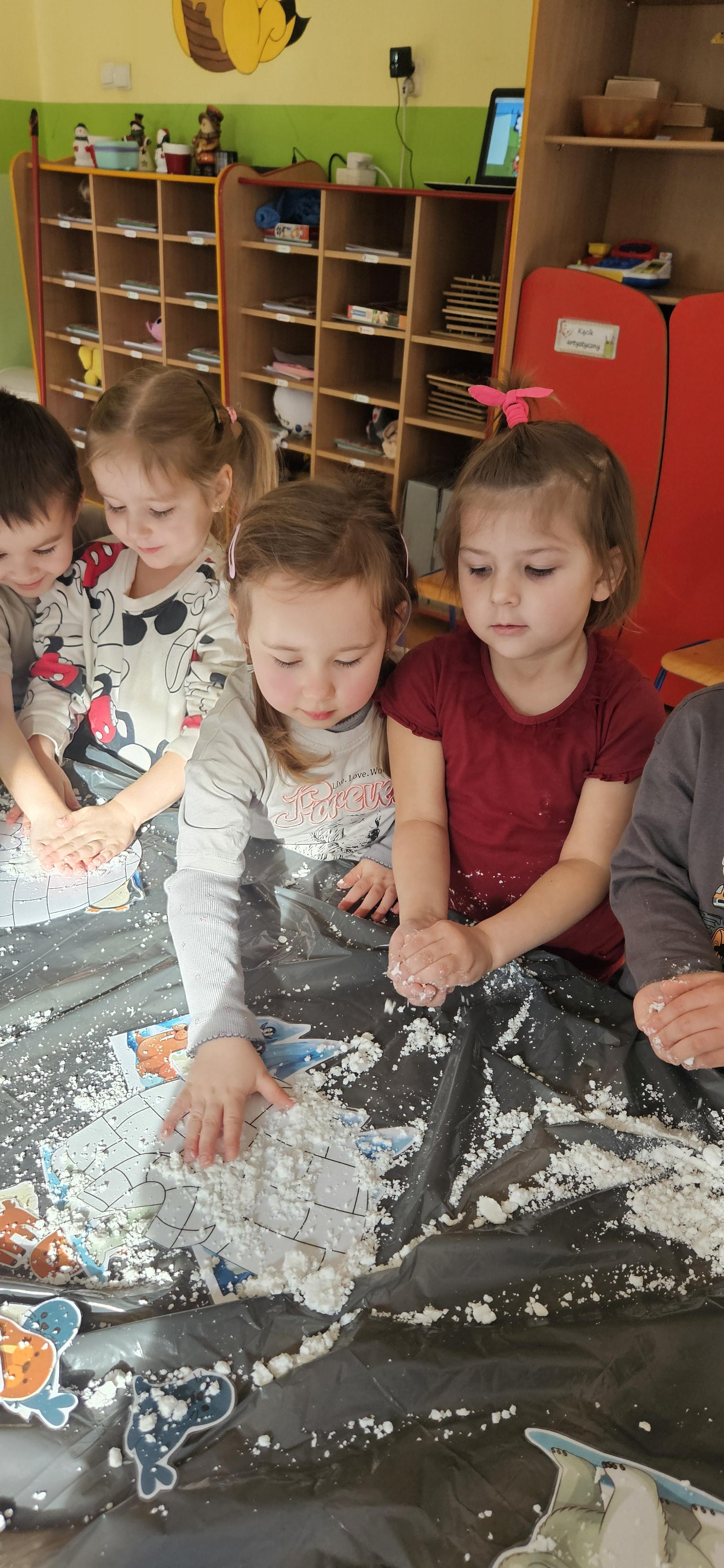 Zabawy ze sztucznym śniegiem oraz malowanie kostek lodu farbami.