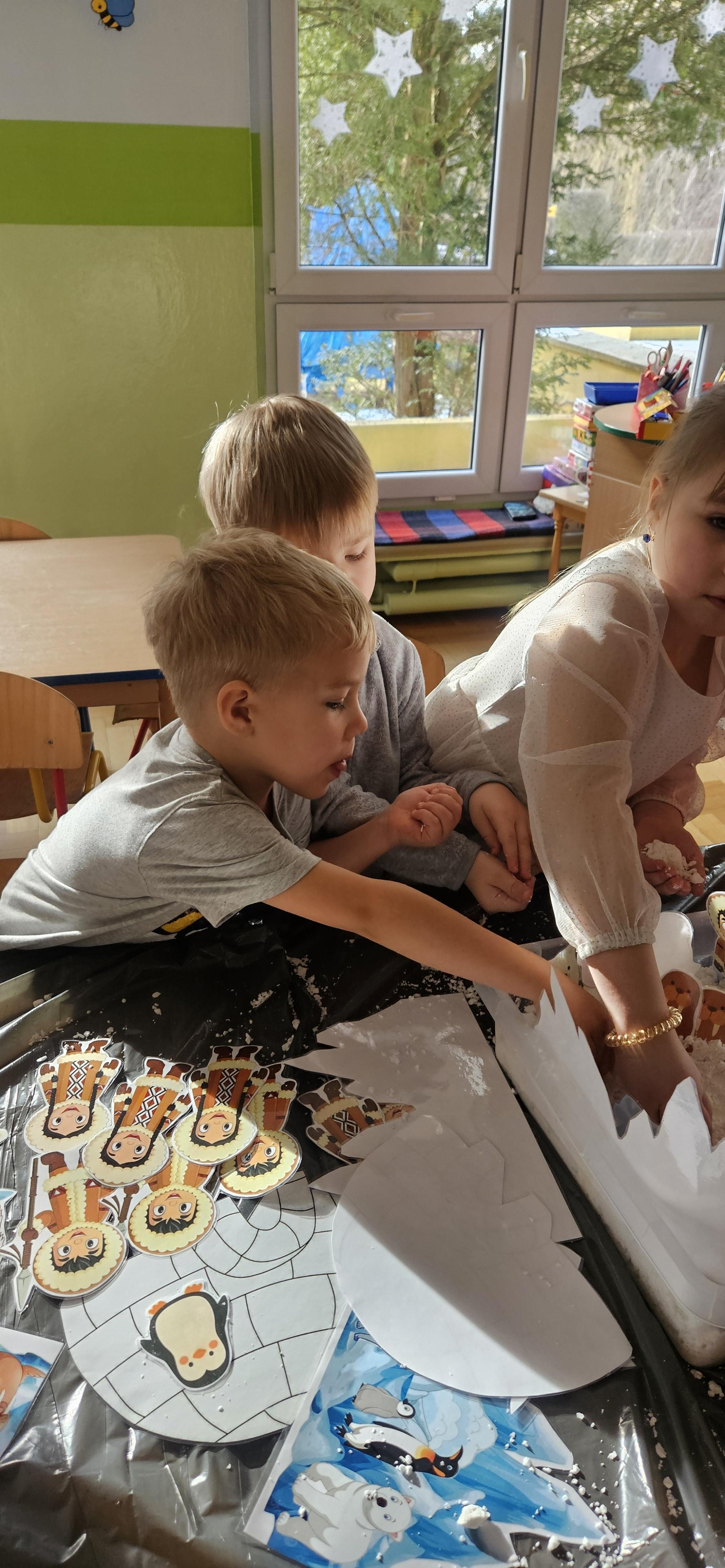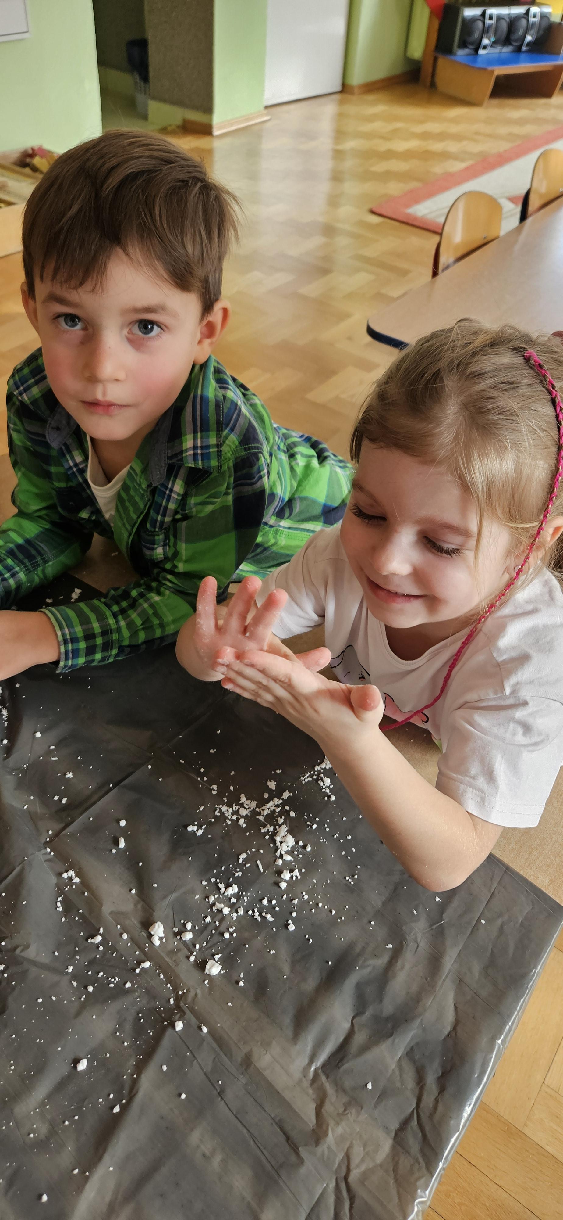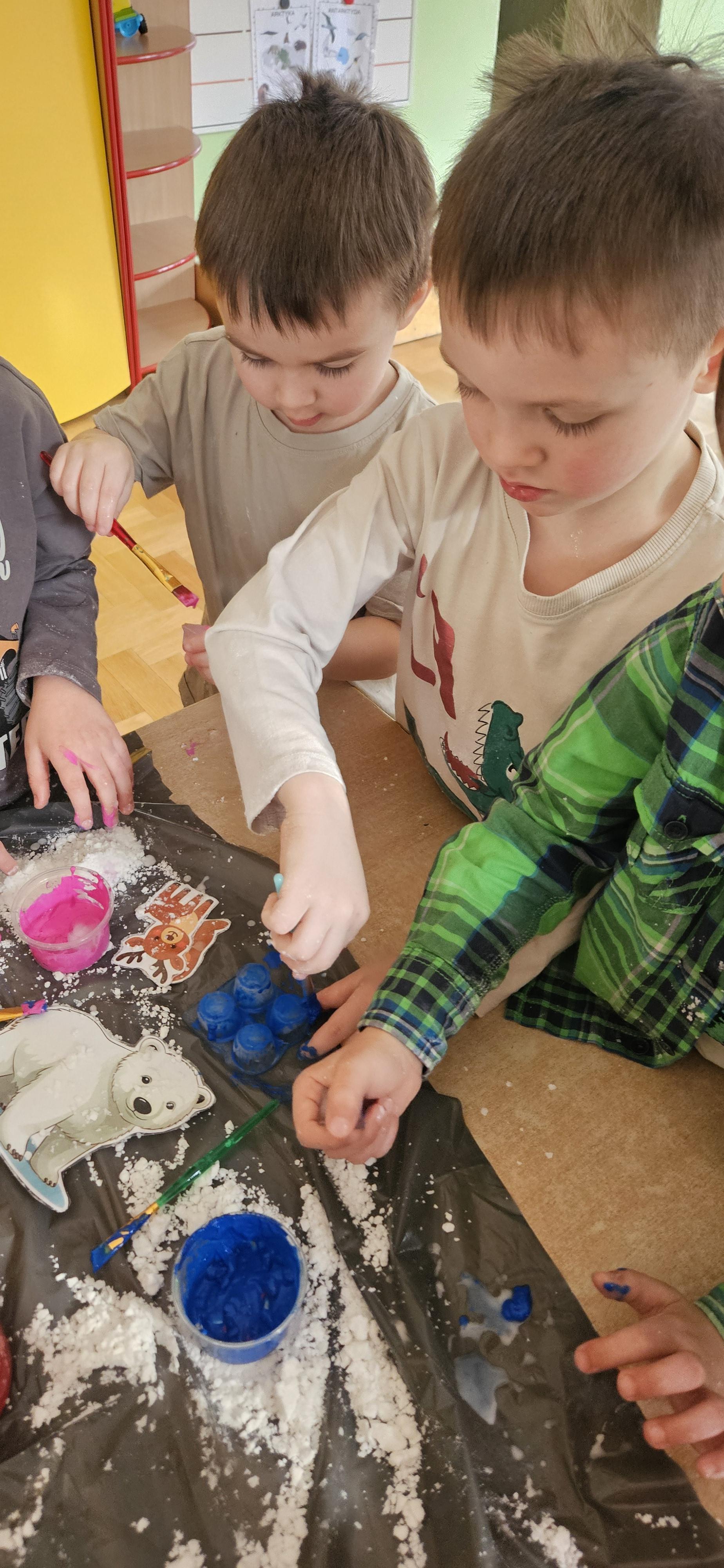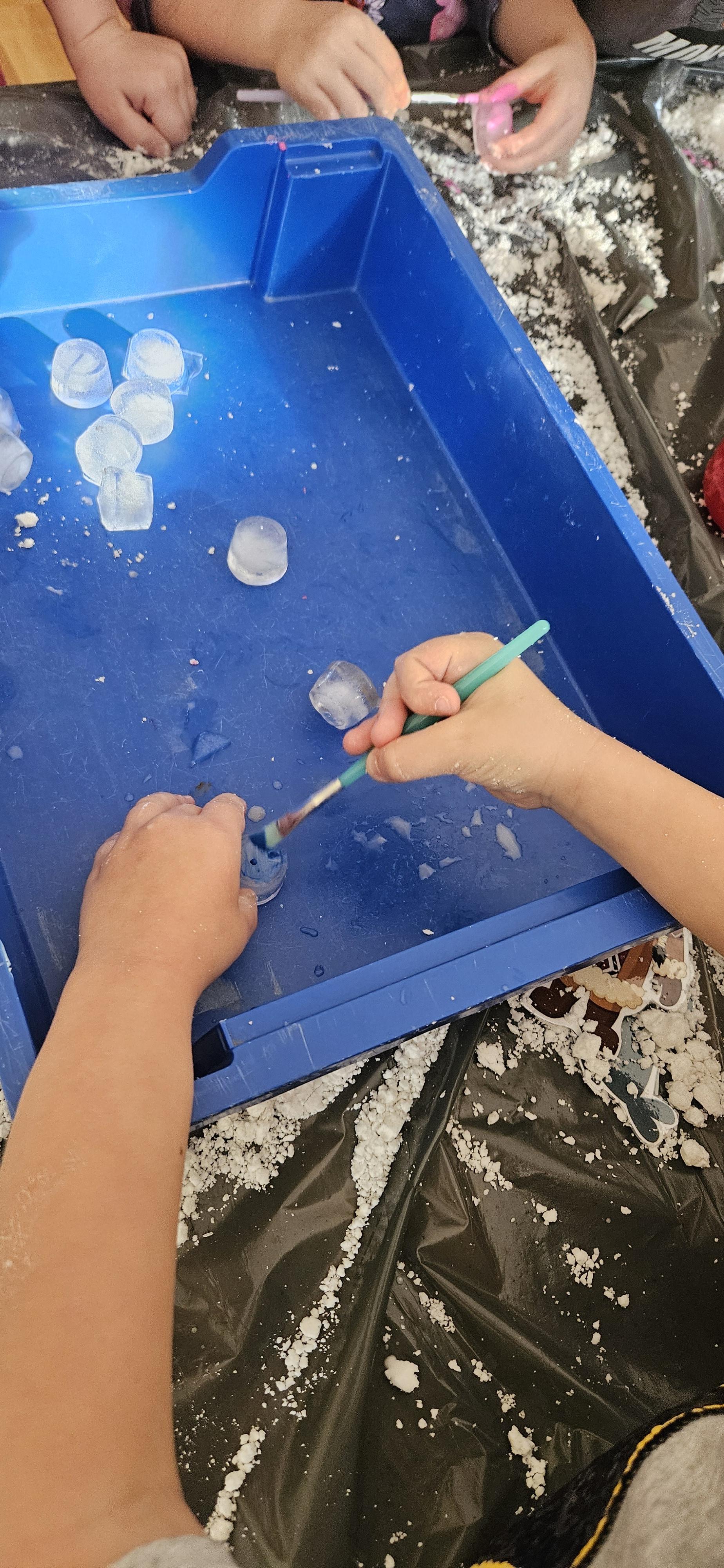 Zabawy ze sztucznym śniegiem oraz malowanie kostek lodu farbami.