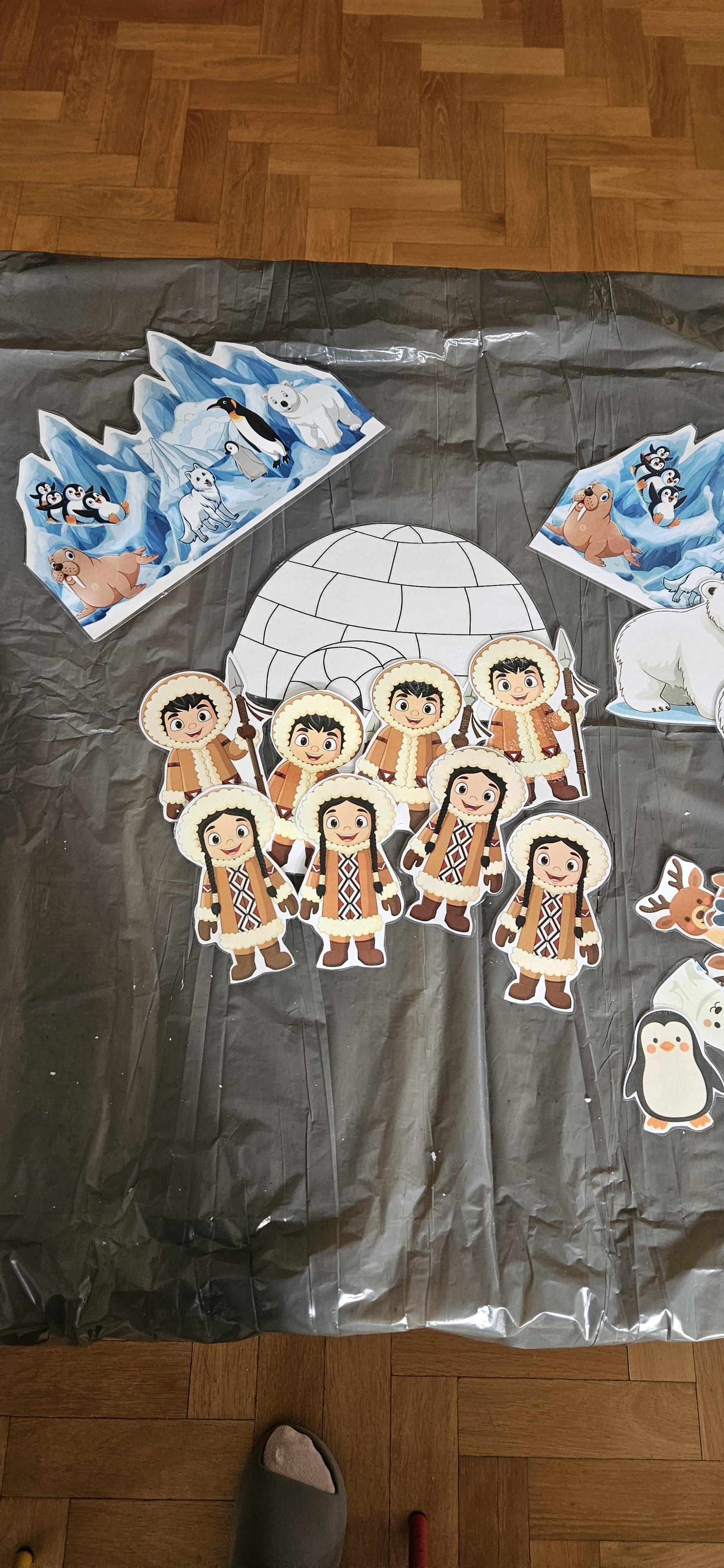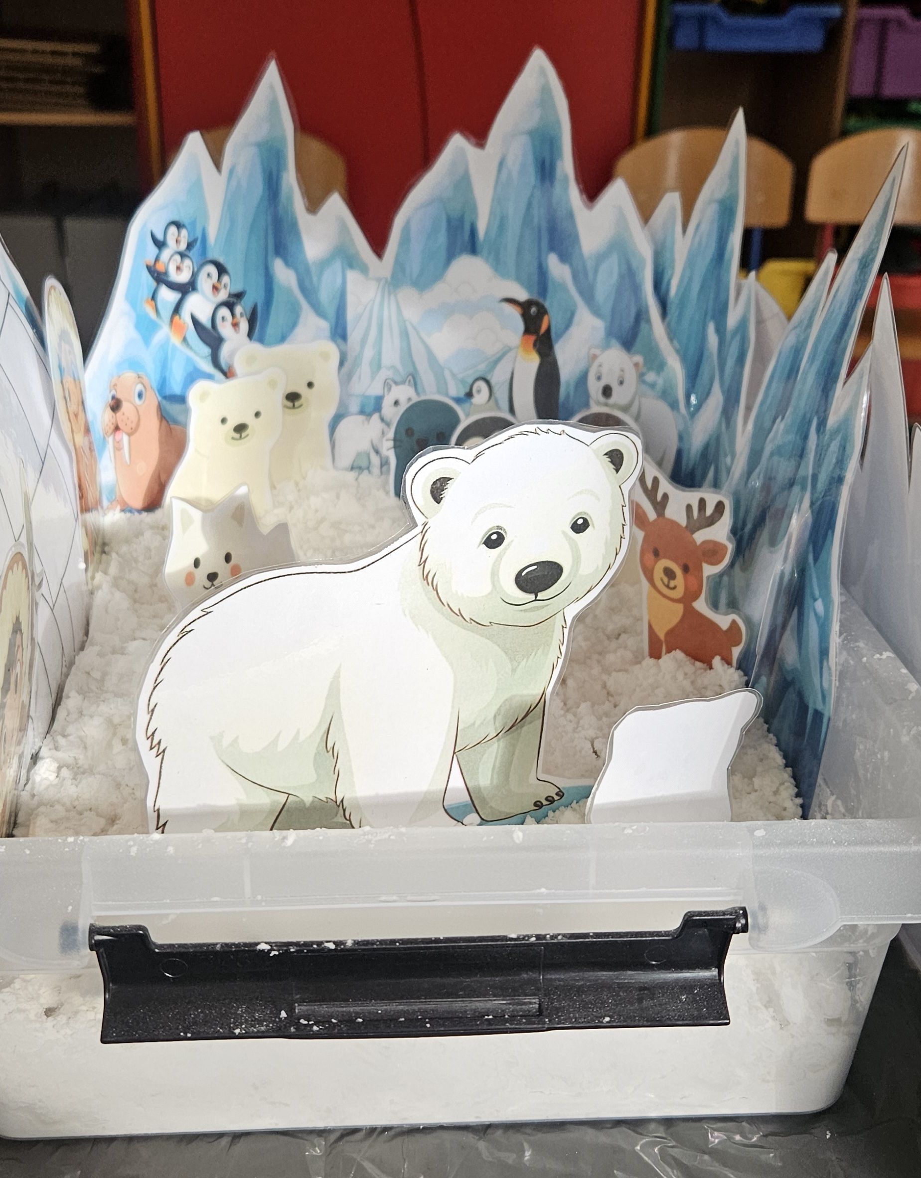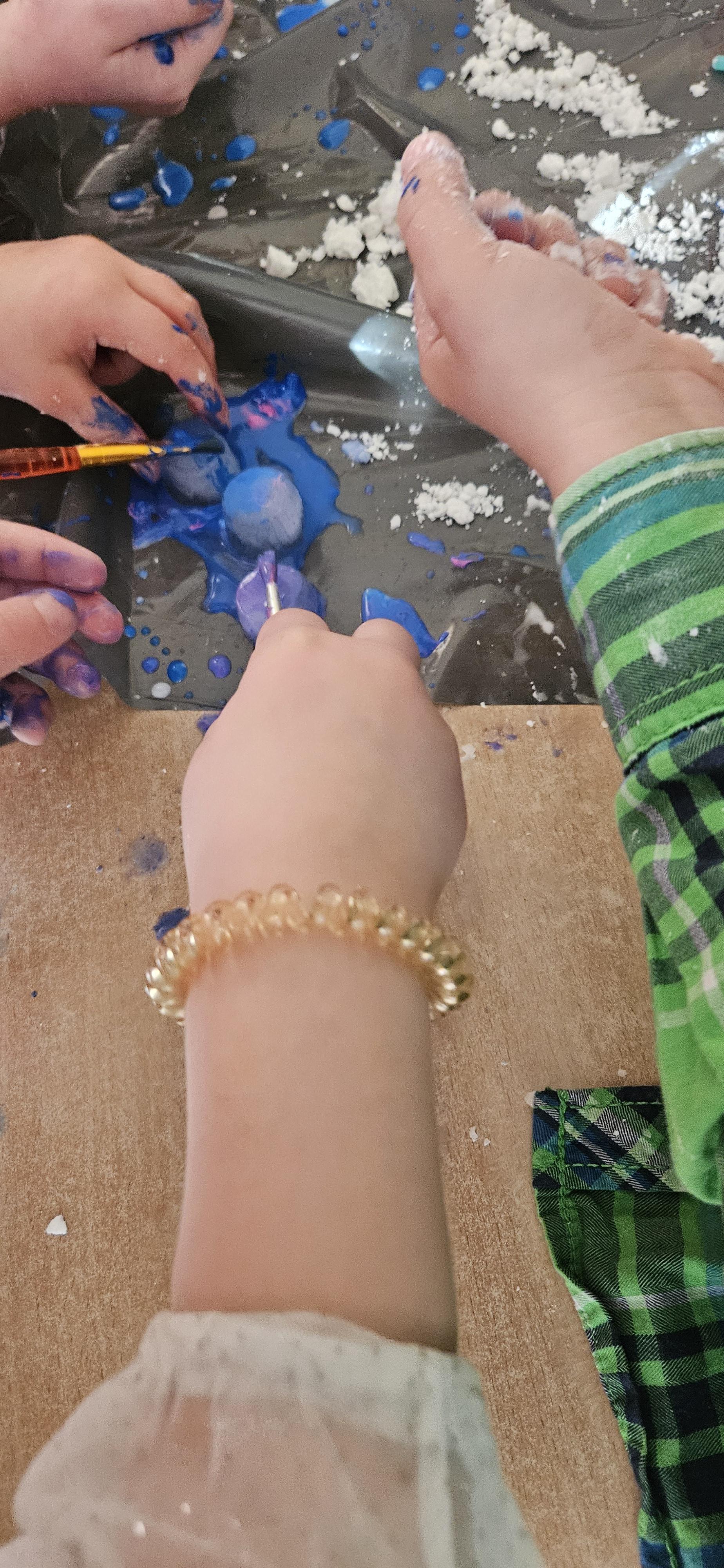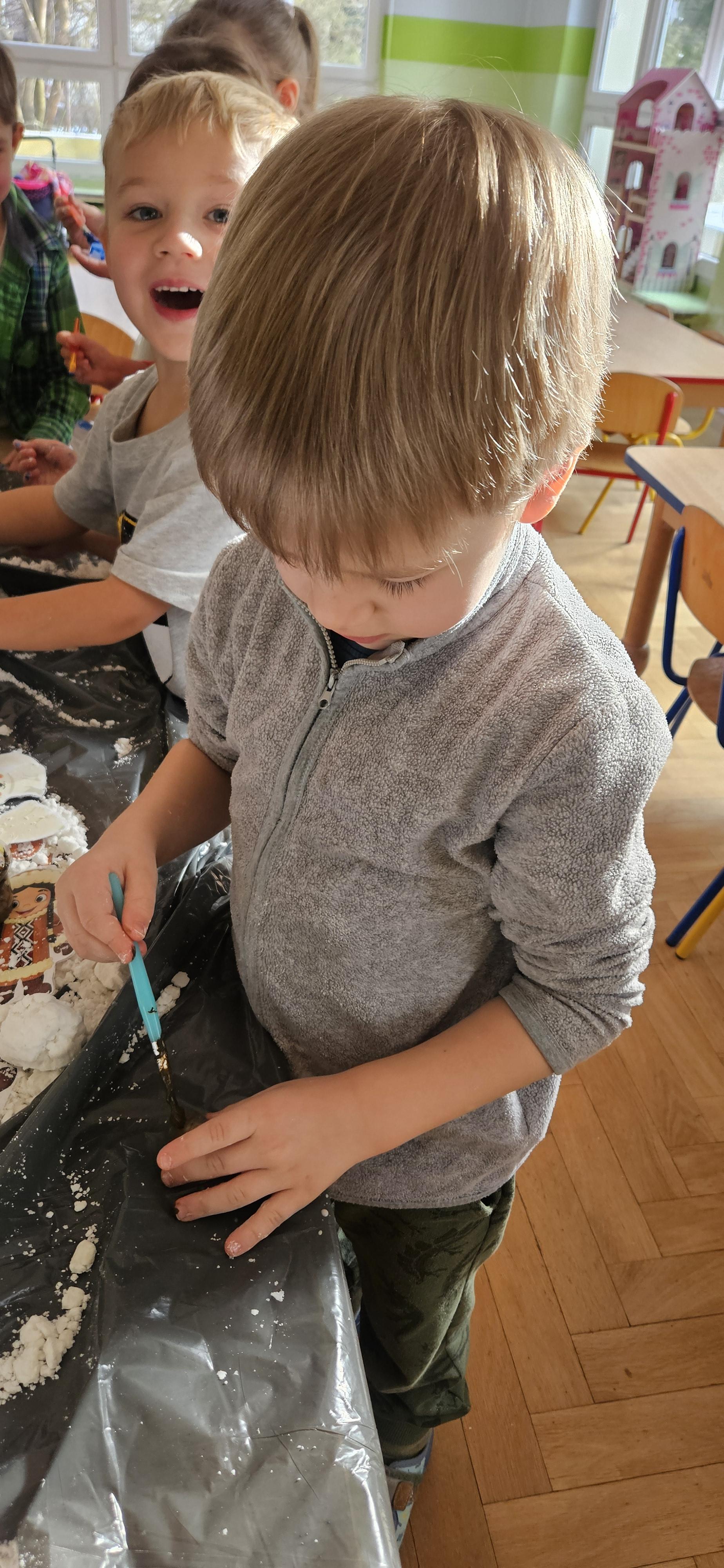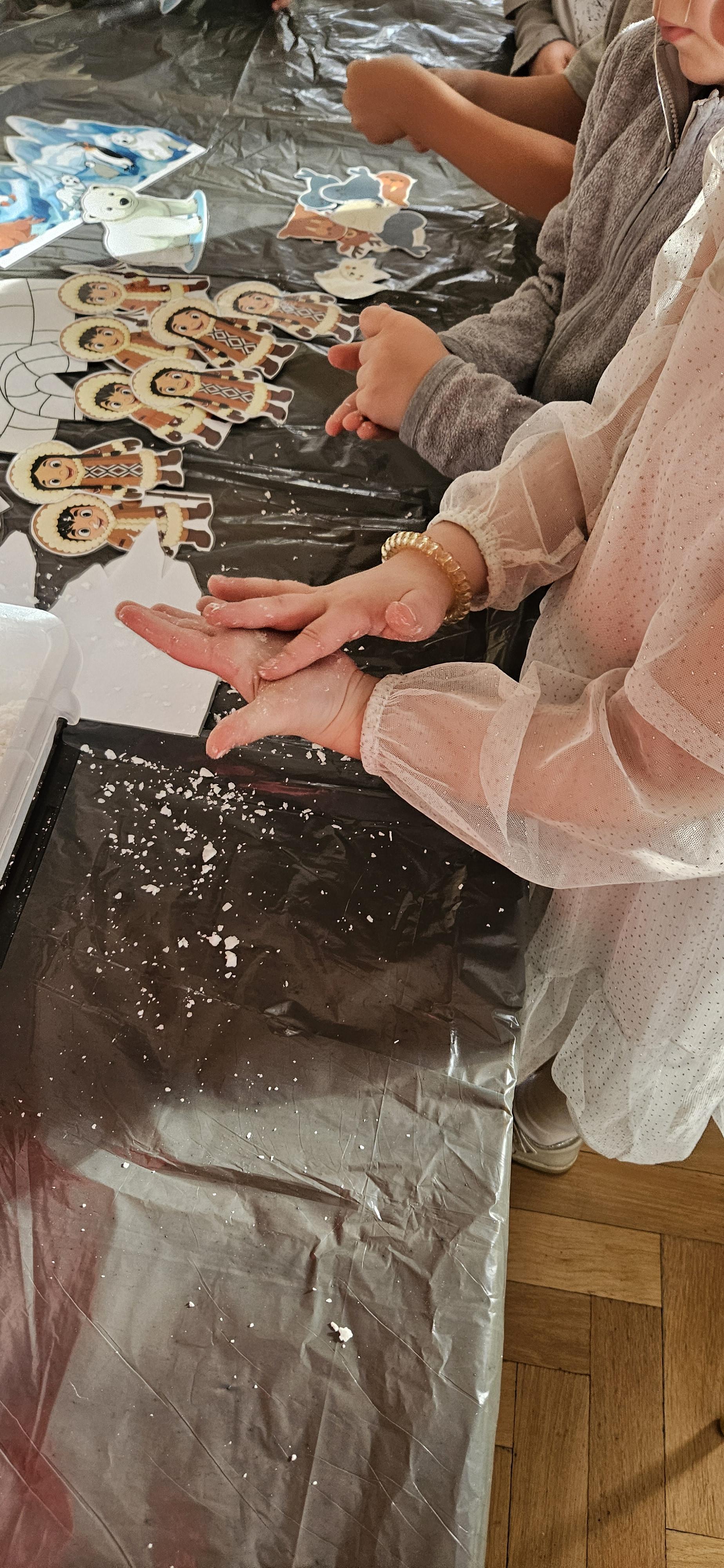 Zabawy ze sztucznym śniegiem oraz malowanie kostek lodu farbami.